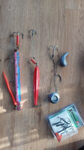 Niekiedy na tym zestawie stosuję własnoręcznie wiązane przypony z jedną przywieszką. Na rynku dostępne są przypony przywieszkowe z dwiema, trzema, czy nawet czterema przywieszkami, dedykowanymi do połowy dorsza. Tego typu „choinki” mocno spowalniają opad pilkera, zakłócają jego pracę i często są przyczyną splątanych zestawów towarzyszy na łodzi. Jedyne „choinki”, jakich używam w Norwegii, to zestawy śledziowo-makrelowe do połowu przynęty.