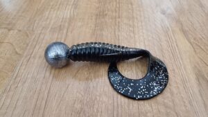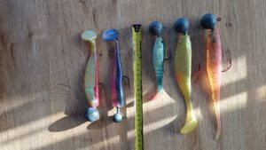 Na ten zestaw bardzo często zakładam przynęty gumowe. Rippery i twistery o długości 15-30 cm, na główkach jigowych lub z wkrętką o masie 100-300 g. Większe przynęty dozbrajam przyponem z sumowej plecionki z kotwicą. Grot kotwicy można wbić w korpus przynęty, ale lepszym rozwiązaniem jest wklejenie w gumę magnesu neodymowego i w ten sposób przytwierdzenie kotwicy do przynęty. Dzięki temu nie zakłócamy naturalnej pracy gumy a w razie brania, przynęta jest mniej narażona na uszkodzenie przez ostre zęby drapieżnika.