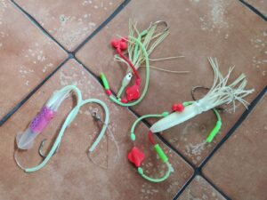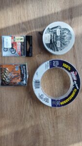 Zabrać należy również szczypce do wyhaczania ryb, kotwice i haki (rozmiar od 3/0-10/0), fluorocarbon (0,7-1,2 mm), metalowe tulejki zaciskowe do fluorocarbonu powyżej 1 mm średnicy (trudny w zawiązywaniu z powodu małej elastyczności). Zamiast fluorocarbonu na przypon można również zastosować wytrzymałą plecionkę sumową o średnicy 1,3-1,6 mm. Taka plecionka jest odporna na przetarcia a ponadto na tyle elastyczna, że można ją wiązać bez potrzeby stosowania tulejek.